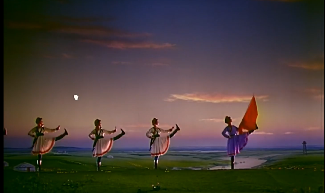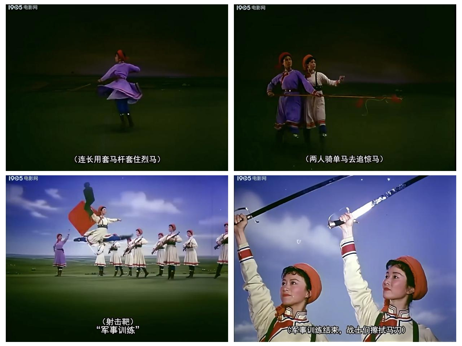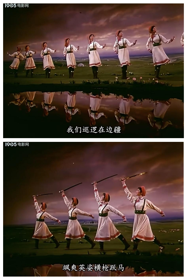《草原女民兵》最初作為舞臺(tái)舞蹈,其美學(xué)特質(zhì)建立在現(xiàn)場(chǎng)性、即時(shí)性與三維空間性之上。而當(dāng)它通過《百花爭(zhēng)艷》的鏡頭被重新詮釋時(shí),經(jīng)歷了一場(chǎng)深刻的美學(xué)轉(zhuǎn)換。電影不僅記錄了這一舞蹈,更通過其特有的語言系統(tǒng),對(duì)舞蹈進(jìn)行了二次創(chuàng)作與美學(xué)升華。