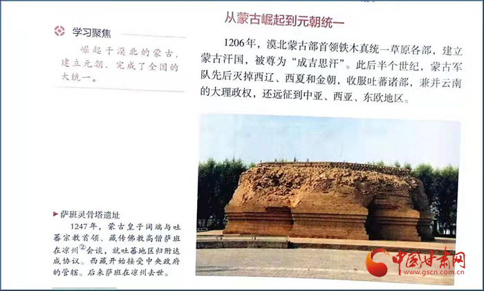在高一歷史課本第56頁中外歷史綱要(上)第三單元有一段記錄“涼州會談”的簡要文字:“1247年,蒙古皇子闊端與吐蕃宗教首領(lǐng)、藏傳佛教高僧薩班在涼州會談,就吐蕃地區(qū)歸附達(dá)成協(xié)議。西藏開始接受中央政府的管轄。后來薩班在涼州去世。”文字右上角是一張薩班靈骨塔遺址配圖。