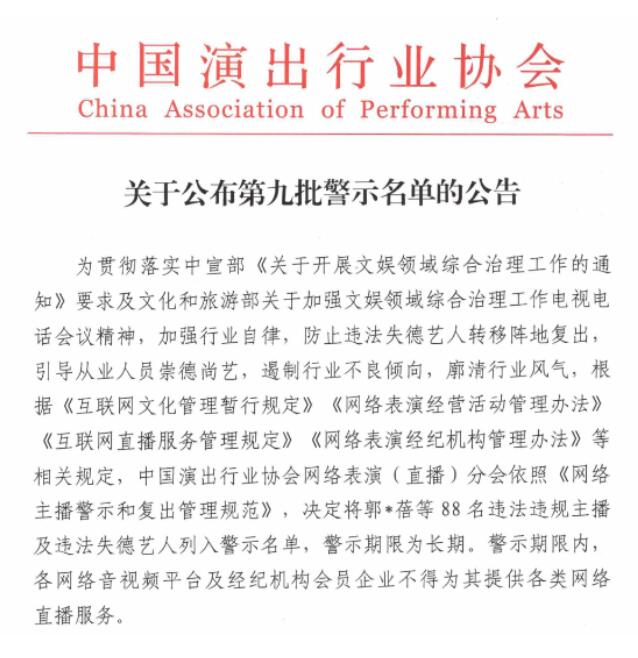 中國演出行業(yè)協(xié)會網絡表演(直播)分會近日發(fā)布了第九批網絡主播警示名單,包括“鐵山靠”“郭老師”兩名職業(yè)主播和“吳亦凡”“鄭爽”“張哲瀚”三名演員在內的88名主播將在行業(yè)內被實行聯(lián)合抵制和懲戒。這是違法失德藝人首次被納入網絡主播警示名單中,防止劣跡藝人轉移陣地復出。