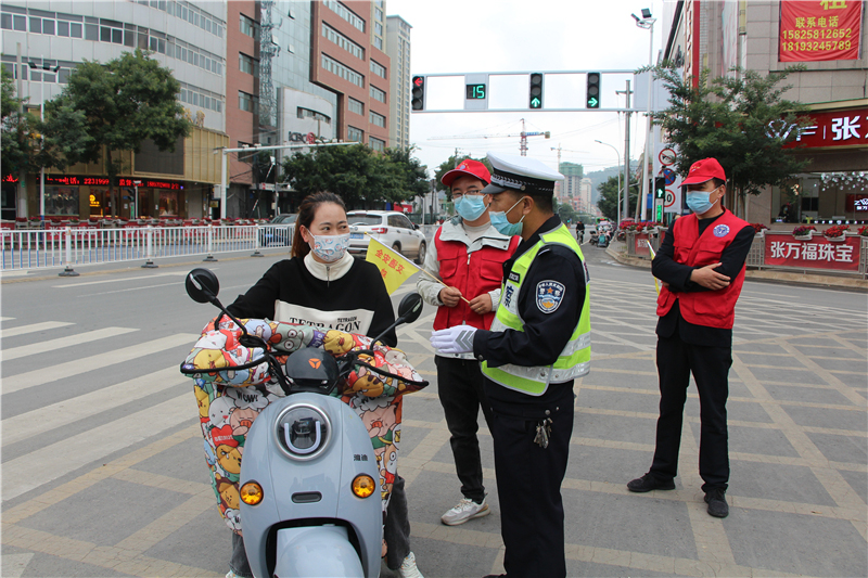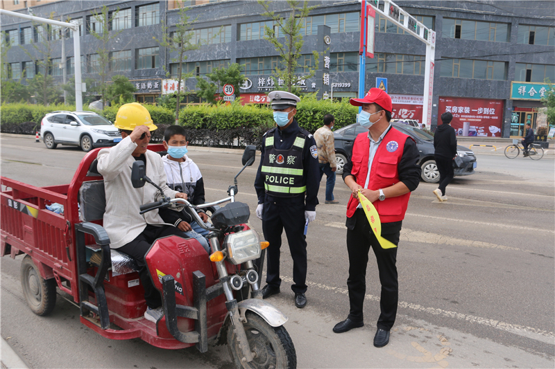 9月28日上午,參加“駕駛?cè)藢W習教育體驗”活動的記滿分駕駛?cè)苏诟拭C定西岷縣小南門十字路口對不文明交通行為認真的進行著勸導。