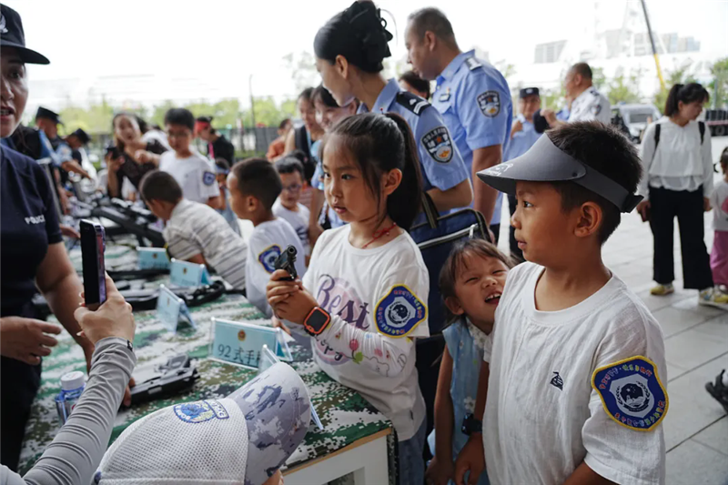 帶著興奮和期待,小朋友們的警營探索之旅開始了!在奧體中心警務(wù)站和警航作戰(zhàn)單元,他們沉浸式參觀了現(xiàn)代警務(wù)工作和警用無人機的指揮調(diào)度,直觀了解了公安工作的日常場景。另一邊,小朋友們在民警的指導(dǎo)下,一個個親手拿著警用武器裝備零距離“拍照打卡”,“這個好酷!”“看我的!”小朋友們的驚嘆聲此起彼伏。