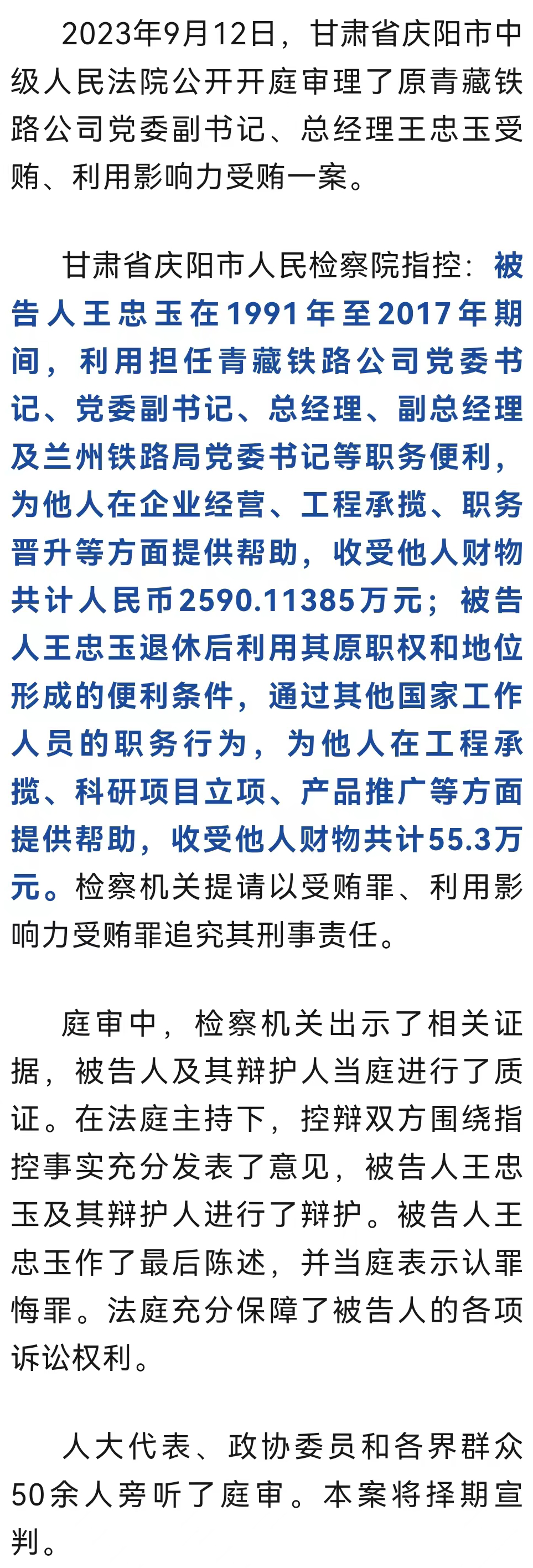 原標(biāo)題:《原青藏鐵路公司黨委副書(shū)記、總經(jīng)理王忠玉受賄、利用影響力受賄案一審開(kāi)庭》