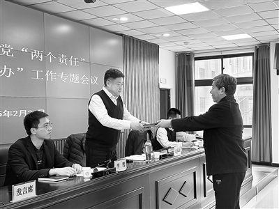 圖為河南省安陽市紀(jì)委監(jiān)委向派駐市水利局紀(jì)檢監(jiān)察組遞交2025年度全面從嚴(yán)治黨監(jiān)督責(zé)任清單,持續(xù)推動“兩個責(zé)任”走深走實(shí)。王小山 攝