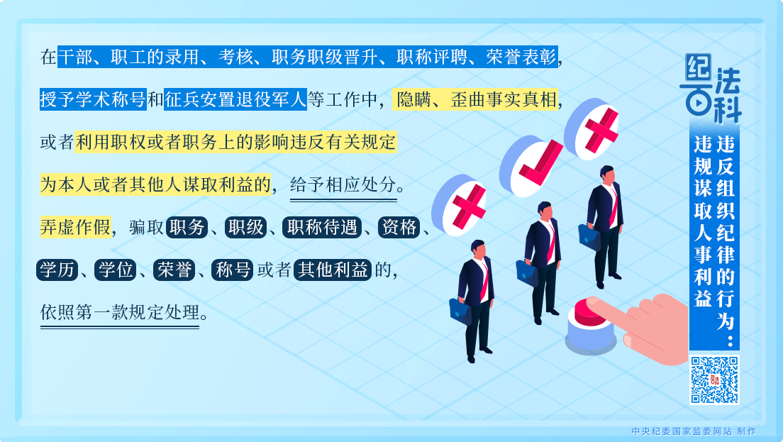 第一款規(guī)定,在干部、職工的錄用、考核、職務(wù)職級晉升、職稱評聘、榮譽表彰,授予學術(shù)稱號和征兵安置退役軍人等工作中,隱瞞、歪曲事實真相,或者利用職權(quán)或者職務(wù)上的影響違反有關(guān)規(guī)定為本人或者其他人謀取利益的,給予相應(yīng)處分。