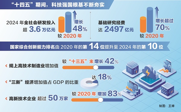 “這五年,科技創(chuàng)新能力穩(wěn)步提升,科技強(qiáng)國根基不斷夯實(shí)。”陰和俊說,我國科技投入持續(xù)增加,2024年全社會(huì)研發(fā)投入超3.6萬億元,較2020年增長48%;基礎(chǔ)研究經(jīng)費(fèi)達(dá)2497億元,較2020年增長超過70%,在量子科技、生命科學(xué)、物質(zhì)科學(xué)、空間科學(xué)等領(lǐng)域取得一批重大原創(chuàng)性成果;國家實(shí)驗(yàn)室體系建設(shè)穩(wěn)步推進(jìn),國家科研機(jī)構(gòu)、高水平研究型大學(xué)科研能力不斷提升,科技領(lǐng)軍企業(yè)加快培育成長;北京、上海、粵港澳大灣區(qū)國際科創(chuàng)中心支撐引領(lǐng)和輻射帶動(dòng)作用不斷增強(qiáng),深圳-香港-廣州躍居全球百強(qiáng)創(chuàng)新集群榜首;國家綜合創(chuàng)新能力排名由2020年的第14位提升至2024年的第10位。