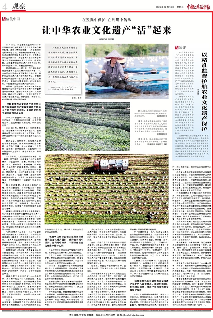 農(nóng)業(yè)文化遺產(chǎn)保護(hù)任重道遠(yuǎn)。申遺成功并非終點(diǎn),而是新的起點(diǎn),后續(xù)仍需持續(xù)挖掘和推廣系統(tǒng)價值。屬地紀(jì)檢監(jiān)察機(jī)關(guān)立足職能職責(zé),主動將農(nóng)業(yè)文化遺產(chǎn)保護(hù)納入監(jiān)督重點(diǎn),著力推動農(nóng)業(yè)文化遺產(chǎn)在發(fā)掘中保護(hù)、在利用中傳承,推進(jìn)中華優(yōu)秀農(nóng)耕文化保護(hù)傳承。