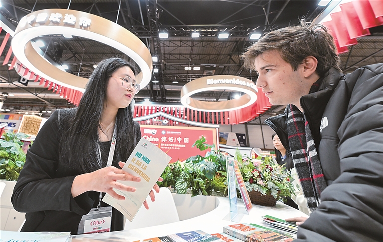 近年來,過境免簽政策持續(xù)擴(kuò)容、免稅購物政策不斷優(yōu)化、“即買即退”適用商店持續(xù)增加……得益于中國日益開放的舉措,越來越多外國游客在中國旅游、購物,感受更加開放包容、多元?jiǎng)?chuàng)新的中國。圖為1月21日至25日舉行的馬德里國際旅游展上,參觀者在中國展臺咨詢。新華社記者 程敏 攝