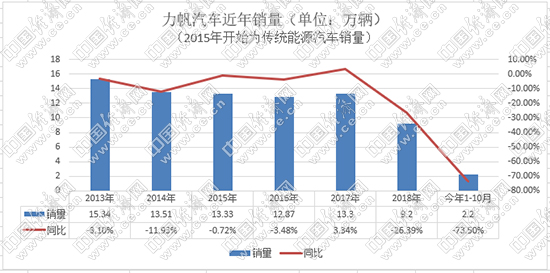 2006年,力帆推出首款轎車力帆520,新車不足5萬(wàn)元的售價(jià)在當(dāng)時(shí)引發(fā)關(guān)注,月銷量一度達(dá)到5000輛。2013年,力帆年銷售汽車15.34萬(wàn)輛,成為汽車界的一匹黑馬。然而,好景不長(zhǎng)。自2016年開(kāi)始,力帆汽車進(jìn)入下行趨勢(shì),目前更是步履維艱。力帆產(chǎn)銷快報(bào)顯示,2019年1-10月,力帆傳統(tǒng)乘用車?yán)塾?jì)銷售2.2萬(wàn)輛,同比下滑73.5%,10月僅銷售29輛;新能源累計(jì)銷售2458輛,同比下降65.42%,10月僅銷售423輛。
