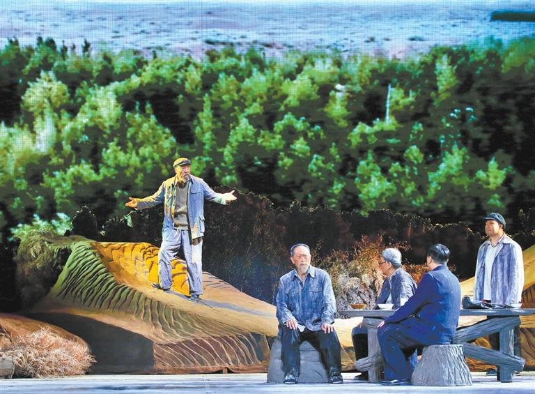 現(xiàn)實題材是話劇藝術的寵兒,在話劇進入中國一百多年的時光中,現(xiàn)實題材創(chuàng)作占據(jù)相當大的比例。在近當代中國歷史的進程中,話劇始終起著敢為天下先、針砭時弊的作用,但話劇又有其極其特殊的藝術框范。人們在觀看話劇時,仿佛就是在觀看自己的人生,觀看自己和身邊最熟悉的人們,這是話劇藝術獨具的極高的審美要求。尤其是現(xiàn)代題材的創(chuàng)作,稍有不慎便會陷入同質化的僵硬模式,使舞臺藝術失去應有的美感。話劇《八步沙》讓6個老漢成為舞臺聚光燈下的主角,體現(xiàn)了創(chuàng)作者們呼應時代之需,為最普通的農民寫生立傳的拳拳之心。6個老農民談不上人們通常意識中的“美”,“治沙”這樣的故事也相對比較單調,不大容易出彩,而創(chuàng)作者們以八步沙這個真實的地名作為劇名,以“六老漢”治沙這個真實的事件作為全劇的敘述內容,卻能宕開一筆把特定的外部環(huán)境與人物的內心世界巧妙地融為一體,為全劇注入了濃郁飽滿的戲劇情境和情感,使這部話劇有了獨屬于自己的一份力度、一份無法替代的光彩。全劇的情節(jié)一曲三折,以小見大,當黑壓壓的沙塵暴鋪天而來的時候,當六老漢在嚴酷的環(huán)境中吃盡苦頭,摸索出“一棵樹,一把草,壓住沙子防風掏”的寶貴經驗,使漫無邊際的沙漠終于出現(xiàn)一抹綠色,繼而眼看著一棵又一棵綠樹成活成林,終于成為一片綠洲的時候,我相信觀眾的心也被藝術琴弦撥動,始終被劇情牽著走,為劇中人物的命運擔心、懸心、痛心、開心,從中深深地感受到劇中所蘊藏的豐富內涵和它所傳達出的真切意趣。