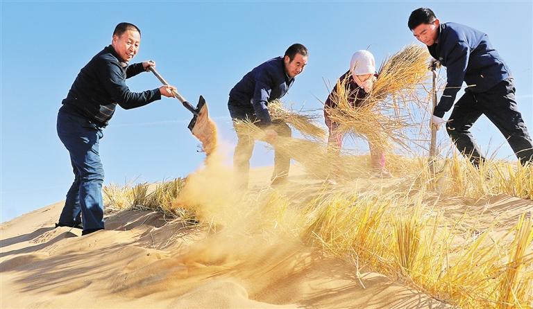 古浪縣八步沙林場(chǎng)工人在騰格里沙漠邊緣打草方格壓沙。甘肅省大力弘揚(yáng)“時(shí)代楷模”八步沙林場(chǎng)“六老漢”的奮斗精神,2012年至2021年,全省累計(jì)完成植樹造林4321.21萬(wàn)畝,沙化土地綜合治理2015萬(wàn)畝。張文燦攝(中經(jīng)視覺)