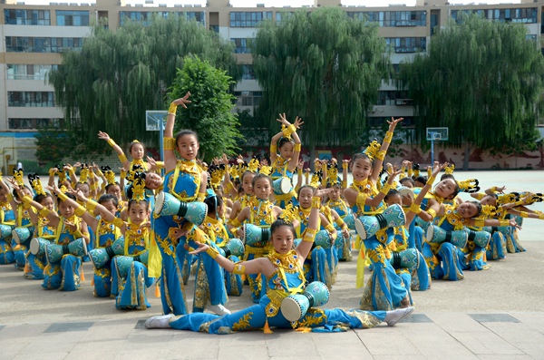 敦煌市南街小學學生排練舞蹈《鼓樂敦煌》。敦煌市委宣傳部供圖