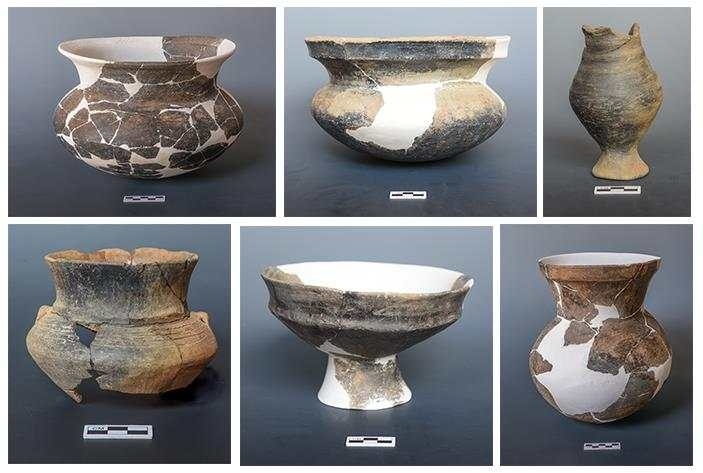 古城村遺址面積約4.2萬平方米,現(xiàn)存的貝丘堆積最厚處達(dá)6.5米,由大量尾部被敲破的螺螄殼與灰土層交替堆疊形成。碳十四測定年代為距今3600至2500年,約相當(dāng)于中原地區(qū)的商代至兩周時期。商代遺存可分為早晚兩段,早段發(fā)現(xiàn)保存完整的橢圓形環(huán)壕聚落,由中心臺地、外圍環(huán)壕和護(hù)坡組成,中心臺地面積約27000平方米,環(huán)壕和護(hù)坡周長約600米,這種聚落格局一直延續(xù)至兩周時期。商代晚段發(fā)現(xiàn)一批土坑墓和甕棺葬。兩周時期的遺存以房址、螺殼堆、灰燼、活動面等居住類遺跡為主,房址多為方形半地穴式。出土青銅器、陶器、玉器、石器、骨器、木器等文物4000余件。