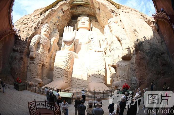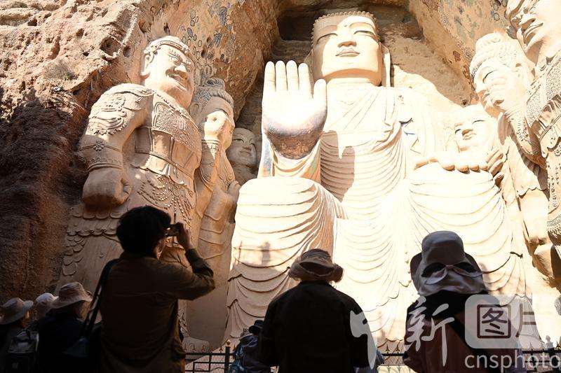4月16日,甘肅省武威市涼州區(qū),學(xué)生在天梯山石窟參觀研學(xué)。