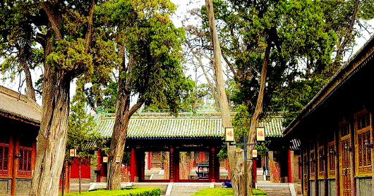 由于山區(qū)祭祀不便,明成化十九年,地方官員向明朝廷申請在秦州專立伏羲廟,于是伏羲祭祀中心從卦臺山移至天水西關(guān)伏羲廟。伏羲廟有確切記載的年代是元代的三皇廟。三皇廟時,規(guī)模較小,沒有塑像,伏羲廟也正是在三皇廟的基礎(chǔ)上創(chuàng)建而成。根據(jù)史料,宋、金、元對三皇陵寢祭祀相當(dāng)重視。廟里多株七八百年,乃至上千年的古樹也是那時所植,這些有靈性的古老的生命,見證了無數(shù)久遠而輝煌的歷史。