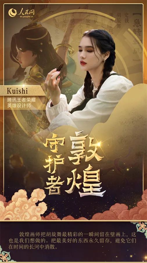 在敦煌千里之外的地方,騰訊的設(shè)計(jì)師們正在研發(fā)新的敦煌文化創(chuàng)新產(chǎn)品。熱門游戲《王者榮耀》的角色美術(shù)師Kuishi以莫高窟第220窟的壁畫為原型,為游戲角色設(shè)計(jì)了全新皮膚,將盛行于唐代的胡旋舞融入現(xiàn)代元素。