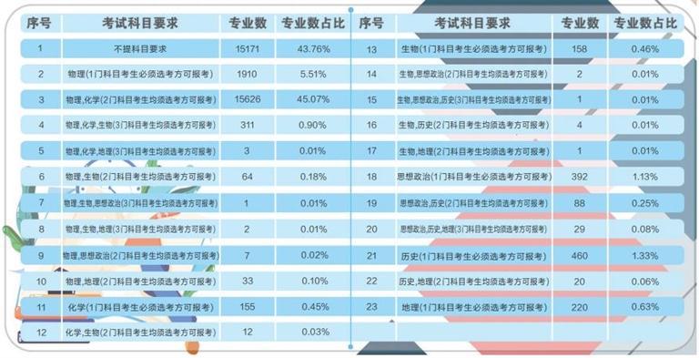 據(jù)了解,根據(jù)《甘肅省深化高等學??荚囌猩C合改革實施方案》要求,從 2021年秋季入學的普通高中一年級學生開始,實行基于統(tǒng)一高考和高中學業(yè)水平考試成績、參考綜合素質(zhì)評價的高校考試招生模式。到2024年,基本形成分類考試、綜合評價、多元錄取的高??荚囌猩贫龋∪龠M公平、科學選才、監(jiān)督有力的高??荚囌猩w制機制。此次在我省報送選考科目要求的高校專業(yè)共計64092條,其中本科專業(yè)34670條。專業(yè)選考科目要求共有23種組合,其中不提科目要求的本科專業(yè)數(shù)量占本科專業(yè)總數(shù)的43.76%,含物理科目的占比為51.79%,含化學科目的占比為46.46%,含歷史科目的占比為1.74%,含“物理+化學”科目的占比為45.98%。