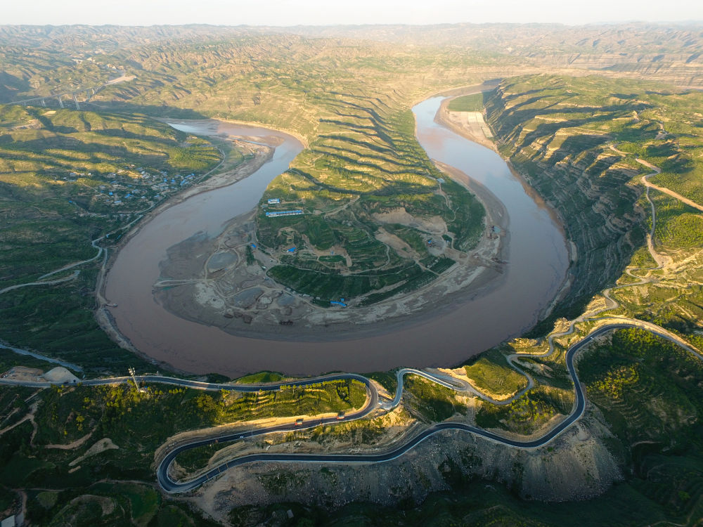 從黃河伏寺灣前穿過(guò)的陜西沿黃公路延安段(2017年8月9日攝)。新華社記者 邵瑞 攝