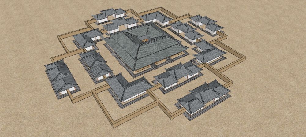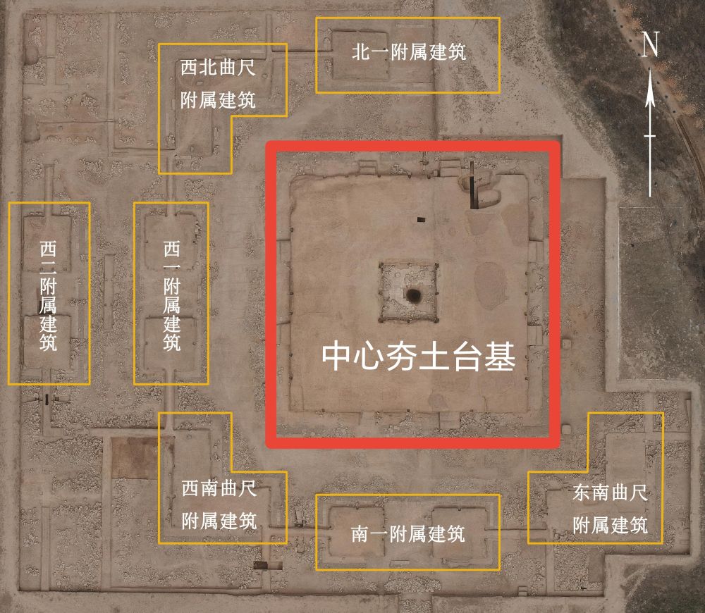 遺址結構清晰——以中心夯土臺基為中心,東西南北各有兩組并行對稱的長方形附屬建筑,四角分布曲尺形附屬建筑。殘留建筑遺跡面積近9000平方米。