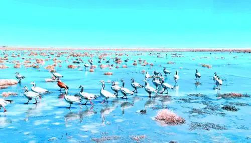 天氣晴朗時,佇立湖邊的山崗上俯瞰湖心,好似一塊無瑕的翡翠。如果你來到這里,可飽覽遠(yuǎn)處草原的天空深邃如井,云如裙裾;近處的湖面上,鳥飛魚躍,這些美景定會讓你流連忘返。