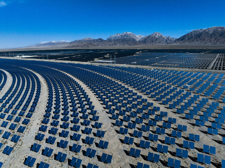 青海省海西蒙古族藏族自治州德令哈市光伏(光熱)產(chǎn)業(yè)園的光熱電站(2024年4月23日攝,無(wú)人機(jī)照片)。新華社記者 張龍 攝