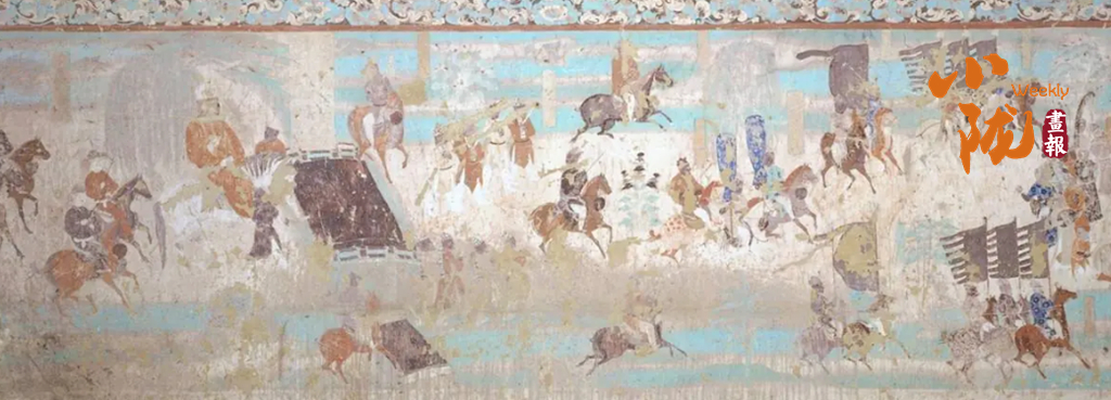 在甘肅璀璨的石窟藝術中,馬早已超越了具象的生靈,化作融入筆墨丹青的文化靈韻。莫高窟的壁畫里,馬的形象栩栩如生、各具風情:西魏249窟的青藍色翼馬,肩生雙翼、身姿輕盈,與仙人并肩起舞,藏著古人對天空與自由的向往;晚唐12窟的作戰(zhàn)圖中,戰(zhàn)馬披甲馳騁、泅水掙扎,真實還原了古戰(zhàn)場的慘烈與悲壯;盛唐時期的駿馬畫像,體態(tài)雄壯、氣度軒昂,每一筆勾勒都藏著時代的審美與家國情懷。