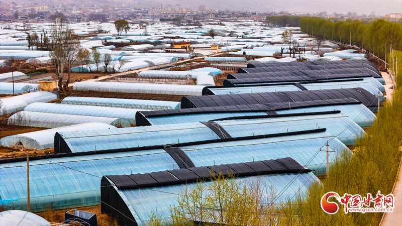 武山縣洛門(mén)鎮(zhèn)宋莊村一座座現(xiàn)代化溫室大棚整齊排列