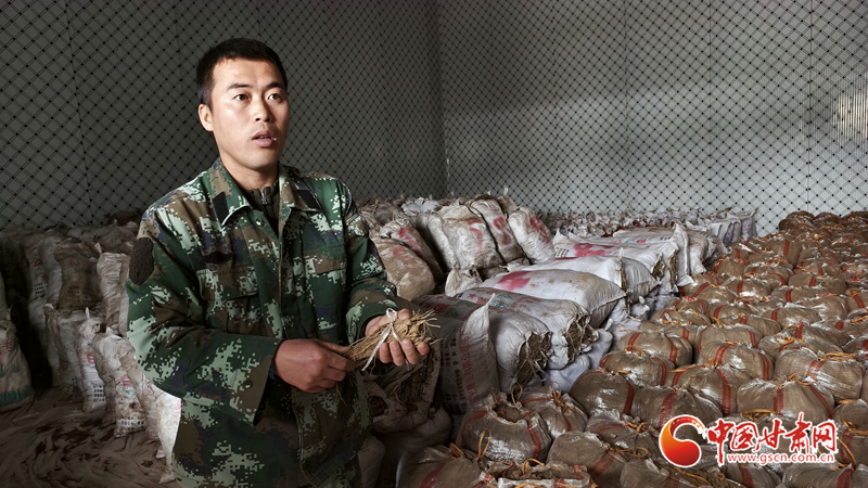 定西禾大壯農(nóng)業(yè)科技發(fā)展有限責(zé)任公司技術(shù)人員李玉棟在冷庫(kù)中展示在大棚中反季節(jié)培育的當(dāng)歸苗