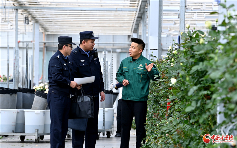 圖為蘭州新區(qū)分局西岔派出所民輔警在新區(qū)農(nóng)業(yè)示范園花卉產(chǎn)業(yè)基地走訪宣傳