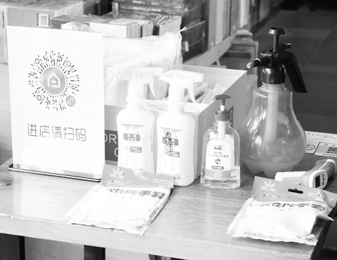 中原圖書(shū)大廈服務(wù)臺(tái)為讀者準(zhǔn)備的掃碼處和防疫消毒用品。