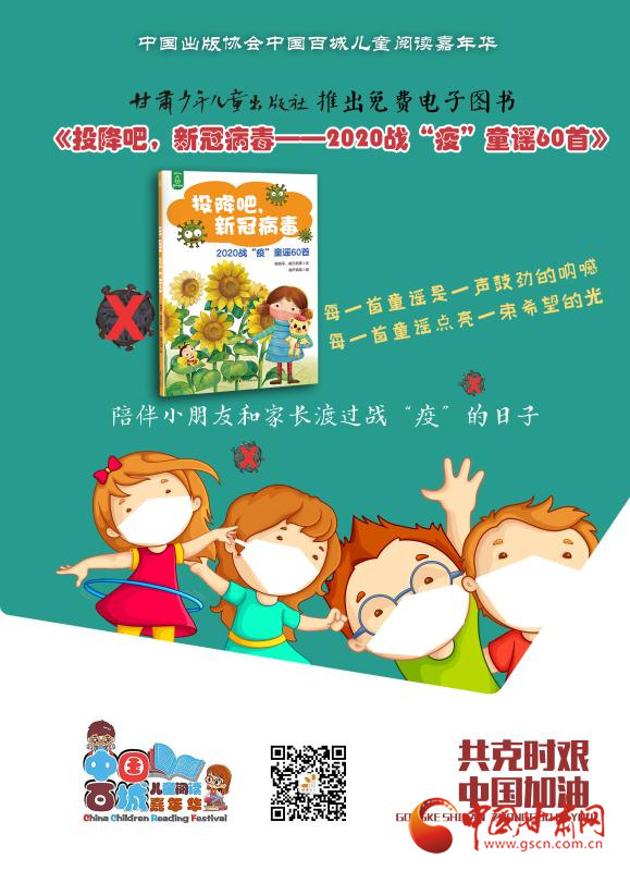 庚子之春,新冠肺炎疫情爆發(fā),全國(guó)人民奮力投身到這場(chǎng)疫情防控阻擊戰(zhàn)中,孩子們、兒童文學(xué)作家也紛紛創(chuàng)作了大量?jī)?yōu)秀的童謠。2月份,讀者出版集團(tuán)旗下甘肅少年兒童出版社(以下簡(jiǎn)稱:甘肅少兒社),策劃上線了免費(fèi)公益數(shù)字出版物《投降吧,新冠病毒——2020戰(zhàn)“疫”童謠60首》。書中收錄60首優(yōu)秀童謠作品,對(duì)兒童進(jìn)行防疫科普宣傳,以期提高兒童科學(xué)防護(hù)意識(shí)和戰(zhàn)勝病毒的信心。一首首童謠匯集起來,架起了孩子和家長(zhǎng)共同抗疫的橋梁,也點(diǎn)亮了孩子們用稚嫩的眼光和思維認(rèn)識(shí)這場(chǎng)災(zāi)難的微光。