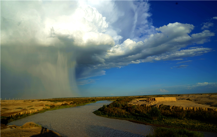 戈壁晚霞和暮鼓,疏勒河流古。聽(tīng)靜水流深,百轉(zhuǎn)千回,澤潤(rùn)荒原土。