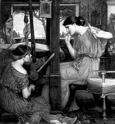 英國畫家約翰·威廉姆·沃特豪斯的作品《珀涅羅珀和她的追求者們》(局部)。資料圖片