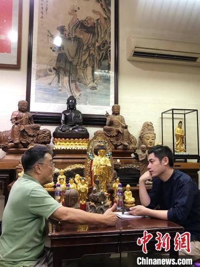 圖為葛亮(右)采訪澳門木雕佛像非遺傳承人 人民文學(xué)出版社供圖