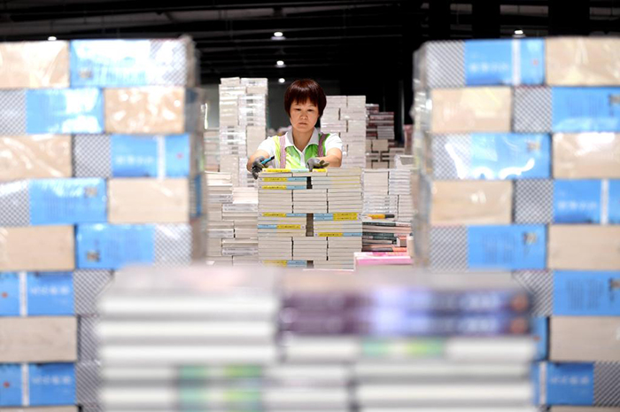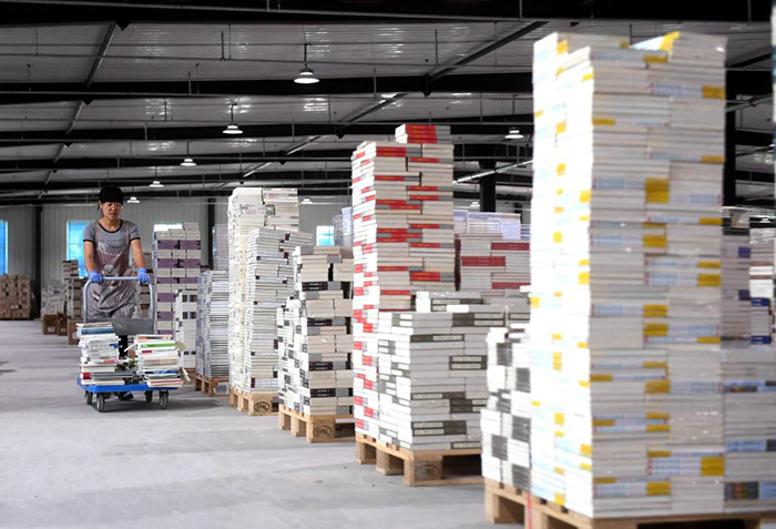 7月2日,在永清縣三圣口鄉(xiāng)一家圖書文化企業(yè)倉(cāng)儲(chǔ)中心,工作人員在整理圖書。