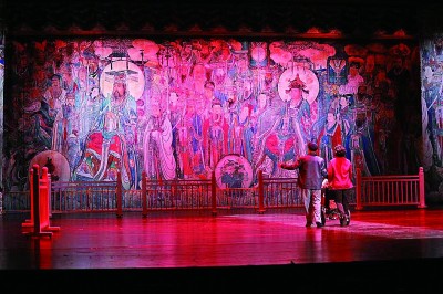 《永樂宮紀(jì)事》創(chuàng)造性地將蒲劇、歌劇、舞劇、話劇、音樂劇等多種藝術(shù)形式有機(jī)結(jié)合、融為一體,在充分利用地域文化元素的同時(shí),還將珍貴的永樂宮壁畫與現(xiàn)代聲光電等舞臺(tái)技術(shù)有機(jī)結(jié)合,營造出絢麗多彩的舞臺(tái)效果。