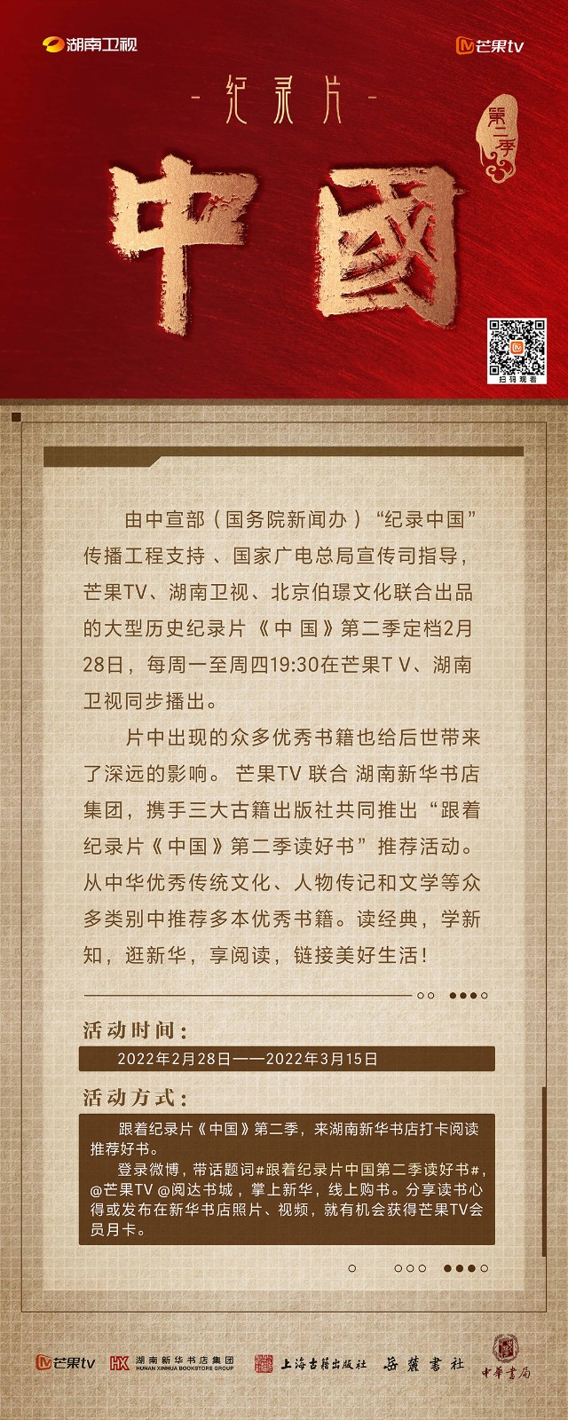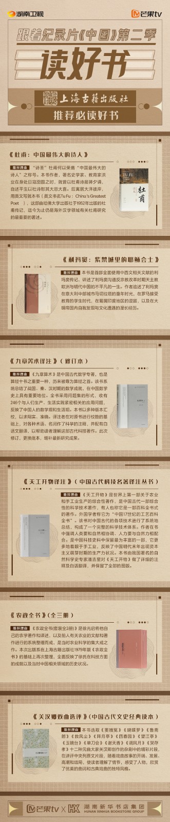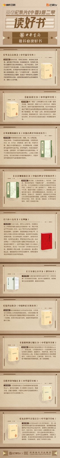 芒果TV以紀(jì)錄片《中國》第二季的精美品質(zhì),聯(lián)合湖南新華書店集團(tuán)的美譽(yù)口碑,將中華書局、上海古籍出版社、岳麓書社推薦的珍品好書,傾情向大眾推薦。本次“跟著紀(jì)錄片《中國》第二季讀好書”活動,將從2月28日持續(xù)到3月15日,湖南新華書店集團(tuán)旗下湖南圖書城、不吝Boolink書店、全省市級中心門店、長沙地區(qū)樂之書店等全員參與,推薦紀(jì)錄片《中國》第二季。書友及觀眾可登錄微博或到線下門店打卡參與活動。