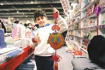 2022年開羅國(guó)際書展上,一個(gè)男孩在中國(guó)圖書展位展示春節(jié)裝飾。