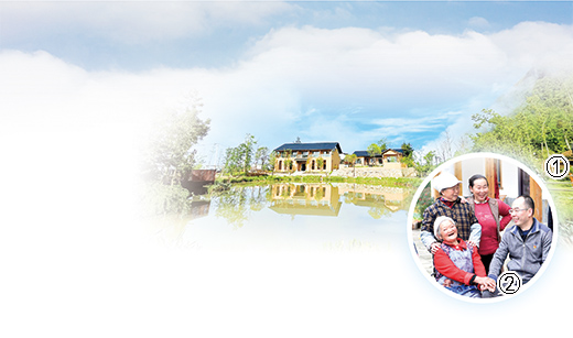 圖①為九坪村民宿風(fēng)光。   圖②為梁宇(右一)和鄉(xiāng)親們在一起。   圖片均為巫溪縣紅池壩鎮(zhèn)黨委供圖