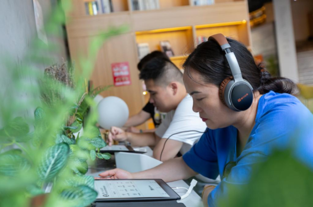 5月16日,在南昌市孺子書房·東湖意庫館,讀者利用聽書機體驗在線閱讀。