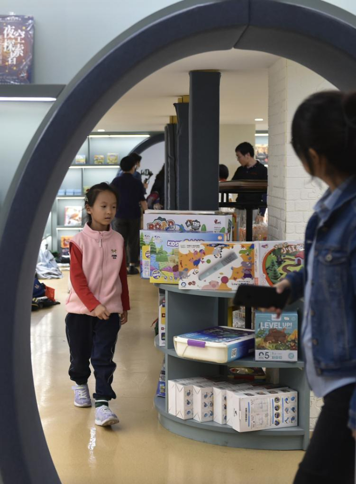 10月18日,家長(zhǎng)帶著小朋友在鄭州市緯五路第一小學(xué)校園閱讀中心內(nèi)閱讀。