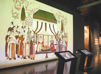 徐顯秀墓北壁壁畫《宴飲圖》互動(dòng)投影墻。人民網(wǎng)記者 王 帆攝