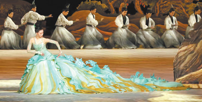 二〇二三年杭州亞運會開幕式“國風(fēng)雅韻”篇服裝設(shè)計“水天碧”長裙,總設(shè)計師楚艷。