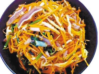 ● 做法:以地產(chǎn)蔬菜胡蘿卜、菠菜和綠豆芽,搭配耳絲、口條、肝片而成,色澤明快、微酸適口:胡蘿卜絲用少許鹽腌至脆柔、綠豆芽焯水保持白嫩、綠菠菜焯過捏去水分切成寸段,這三樣食材搭配營(yíng)養(yǎng)成分暫且不說,單就紅、白、綠三色,就足夠醒目了。正宗的天水酒碟還要配以鹵豬耳、豬肝和煮熟的拆骨肉,最后點(diǎn)綴以綠綠的香草。