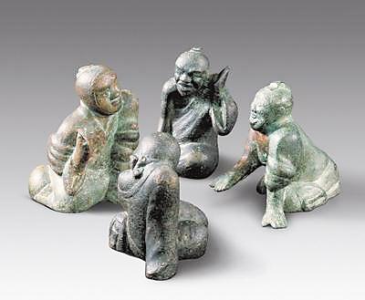 20世紀(jì)90年代甘肅靈臺縣出土了一組西漢銅質(zhì)博戲俑。俑最高9.2厘米,最寬9.7厘米。四俑相向跪坐,身著高領(lǐng)長服。其中二人頭挽發(fā)髻,二人以寬巾裹頭。坐姿不同,形態(tài)各異,有的前傾仰首,有的垂臂塌肩;有的袒胸露膊,似在伸手探取;有的屈腿斜身,默然扶膝靜坐。四俑的面部表情不同,刻畫細(xì)膩。他們或喜笑顏開,或嚴(yán)肅面對,或凝神沉思,或略顯悲愁,神態(tài)活現(xiàn),精彩逼真,具有高超的藝術(shù)性和研究價值。