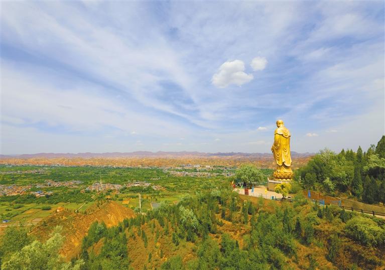 一座金燦燦的大佛造像矗立在山頂,慈眉善目,俯瞰著山下的苦水川。