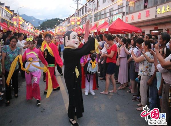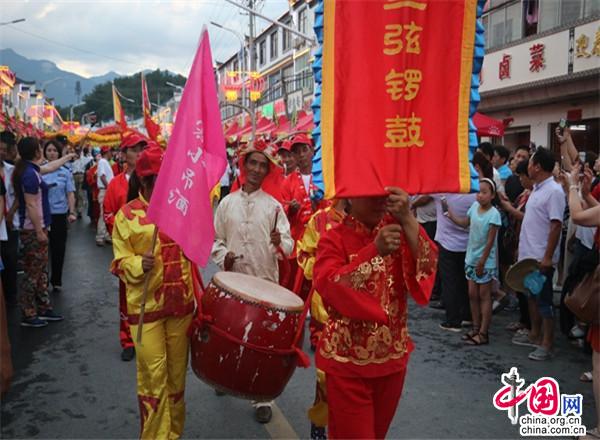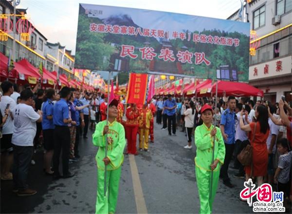 小鎮(zhèn)很熱鬧。小鎮(zhèn)現(xiàn)已入駐了十幾家大型連鎖超市,500多家賓館飯店,300多家購物店。每到雙休日,操著各色口音的四海賓客在街上蹓跶、徜徉,或在超市購物店里選購精美的土特產(chǎn),或在酒店里品嘗著山珍野味,或在KTV里痛快豪嗓,或圍著篝火歡歌勁舞,有的干脆就光著膀子在露天的小吊鍋前劃拳行令,恣意灑脫,好不愜意。每年農(nóng)歷六月初六,天堂寨都要舉辦隆重的天貺節(jié),天堂寨鎮(zhèn)政府門前的一公里主街道兩邊擺起了長龍似的紅色帳篷,“百家吊鍋宴”成為中外游客免費品嘗天堂寨美食的饕餮盛宴。人們一邊喝著小吊美酒,吃著山珍美味,一邊欣賞著穿街而過的威風(fēng)鑼鼓、騰龍舞獅、儺戲花船、獨輪推美女、花棍打癡郎等不斷推陳出新的民俗風(fēng)情表演。酒足飯飽之后,再到政府廣場觀看精彩紛呈的文藝節(jié)目。一時間,人山人海,把一個千米“長街”擠得水泄不通;歡聲笑語,把一個深山小鎮(zhèn)匯成了歡樂的海洋……