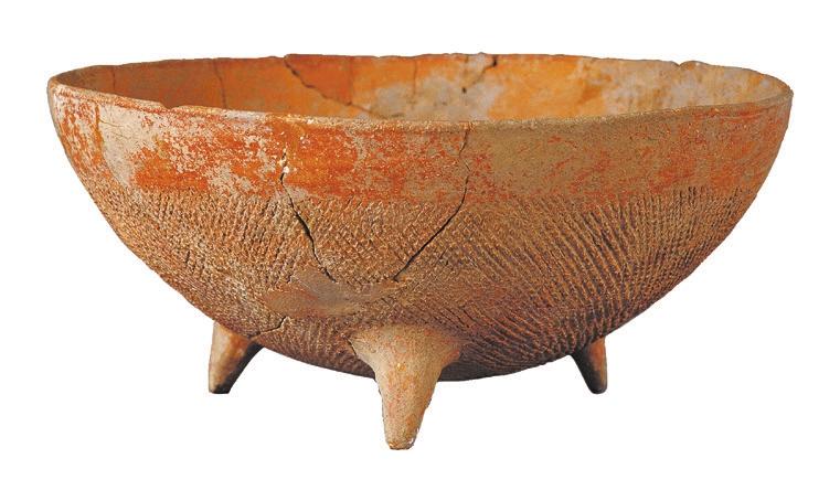 距今7800-7300年,這是只非常古樸粗糙的陶器,夾著細(xì)沙的紅陶,除了缽口內(nèi)外裝飾的紫紅色寬帶紋就沒有別的裝飾了,造型卻也獨(dú)特,在圓形鈸底有三只短短的足。若說此彩陶缽再?zèng)]別的裝飾,似不準(zhǔn)確,有細(xì)心的人會發(fā)現(xiàn),缽身細(xì)密地布滿交叉網(wǎng)狀的繩紋。沒錯(cuò),這種繩紋是大地灣文化彩陶最為典型的特征,并不僅僅在這只彩陶缽上有,大地灣出土的其他彩陶上都有這個(gè)最具代表性的紋飾特征。但這種繩紋本就不是做裝飾用的,而是在制陶時(shí)壓印上這些繩紋使陶坯更加結(jié)實(shí),另外,制成的缽?fù)氲忍掌饔辛诉@些繩紋可使得表面變得粗糙,人們可以捧得更牢,不容易失手摔碎。要知道,新石器時(shí)代早期生產(chǎn)力水平是多么的低下,遠(yuǎn)古先民制這么一只彩陶器可是不容易呢。