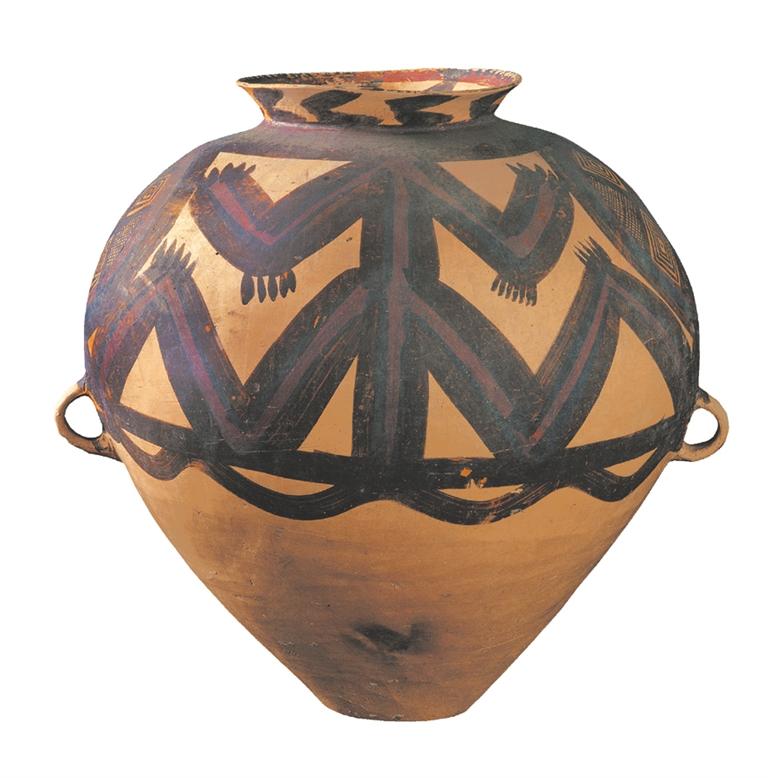 馬家窯文化半山類型(距今約 4500 年),廣河縣地巴坪出土。這是雙耳甕器型大氣貴重,施以紅、黑二彩,紅、黑彩交替使用,腹部繪多層連續(xù)垂弧紋和鋸齒紋,黑、紅彩交替使用,由三組分層連續(xù)的垂弧紋組成整體圖案,每層由兩層黑色帶紋和一層紅色帶紋組成,黑色帶紋上緣繪向上的鋸齒紋。整個圖案密集繁復(fù),俯視猶如一朵盛開的鮮花,造型豐滿,色彩鮮艷。