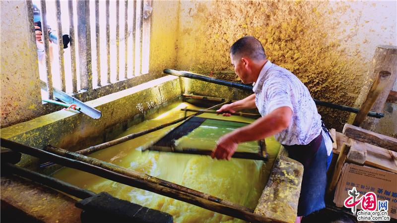 隆回縣灘頭鎮(zhèn)桃林村手工抄紙作坊,已經(jīng)成為一處著名的文旅項目景點。走進陶林村,一棟棟青瓦石墻的新屋吸引了人們的目光。屋外山坡竹林茂密,山溪流水潺潺,屋內手工抄紙制作的原料、工具布置的次序井然,手工抄紙的全套工藝流程在這幾棟屋中得以完整體現(xiàn)。手工抄紙技術歷史悠久,始于隋唐,至明朝時抄紙已經(jīng)非常盛行。上世紀八十年代鼎盛時還曾遠銷東南亞和日本。非遺傳承人李志軍今年61歲,自稱“紙蟲”,帶領著全家人承襲著祖宗留下的獨特技藝。而支撐著李志軍的堅守的,是隆回縣文旅部門的巨大付出和努力。2011年,他們支持李志軍建立了手工抄紙標準化作坊,2016年又對該作坊進行擴建,使之成為國家級非遺項目。灘頭手工抄紙作坊占地面積1714平方米,是灘頭手工抄紙有史以來最大的作坊,同時也是集生產、創(chuàng)新、傳承、展示、研學為一體的重要基地和文旅基地。