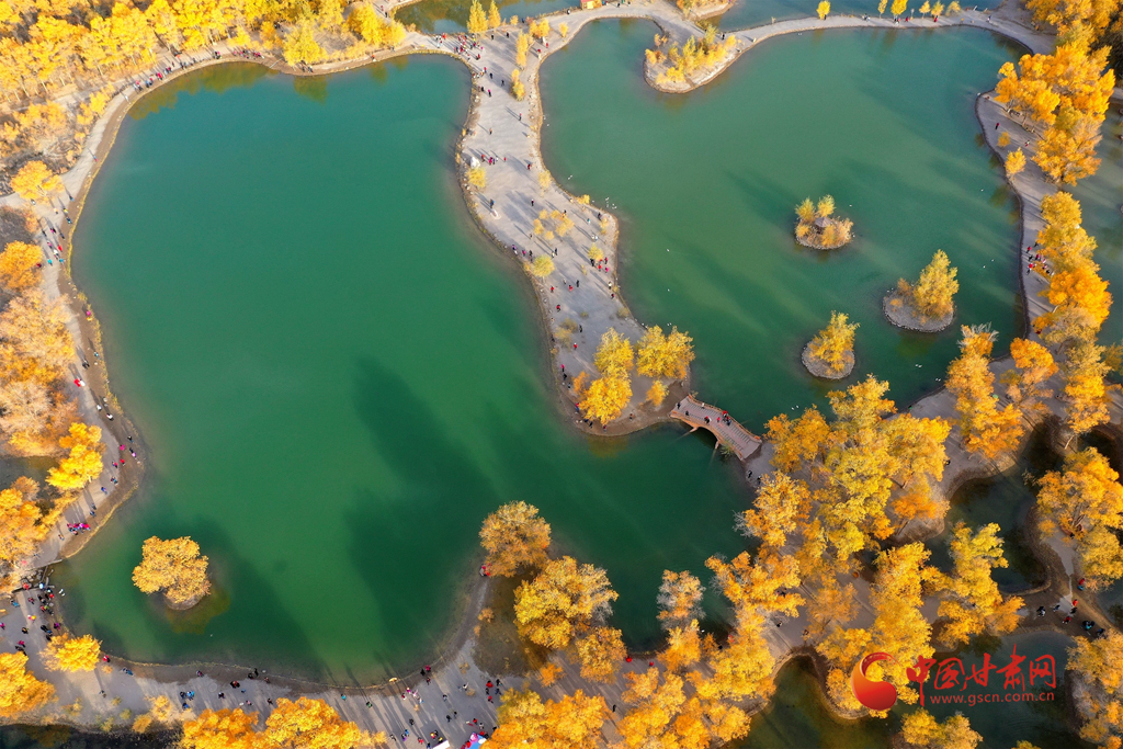 10月10日,在甘肅省酒泉市金塔沙漠胡楊林景區(qū),胡楊林在陽(yáng)光的照耀下金黃燦爛,與湖水相映,令人流連忘返。(無人機(jī)照片)